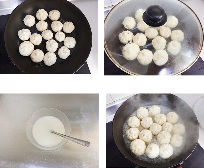 Bắc nồi lên bếp hấp chín bánh, sau khi bánh chín thì lấy ra khỏi bếp. Chuẩn bị hỗn hợp gồm 8g bột bắp trộn đều cùng 100ml nước. Sau đó cho bánh bao vào nồi và rưới hỗn hợp này lên, đun trong khoảng 4 phút để nước cạn.
