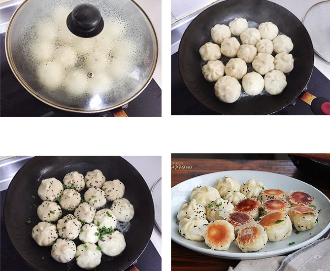 Cuối cùng, khi nước đã dần cạn hết, bạn cho mè rang và hành lá thái nhuyễn vào, nấu cho đến khi nước cạn hoàn toàn, phần đáy bánh có màu vàng cháy cạnh thì đảo bánh trên chảo khoảng 1 phút rồi tắt lửa.