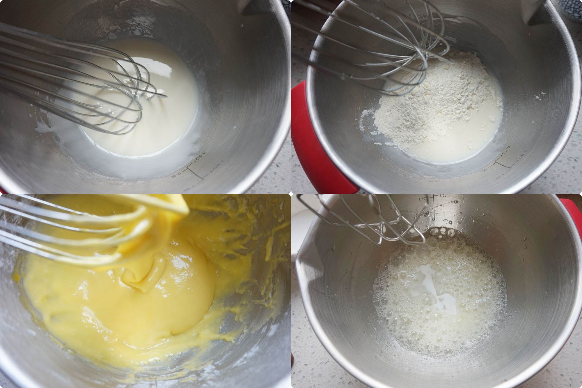 Cho sữa tươi và dầu ngô vào âu trộn đều. Rây bột mì vào âu sữa, tiếp đó tách lấy 2 lòng đỏ trứng vào trộn đều. Phần lòng trắng tách riêng sang một âu khác rồi thêm 30g đường vào.