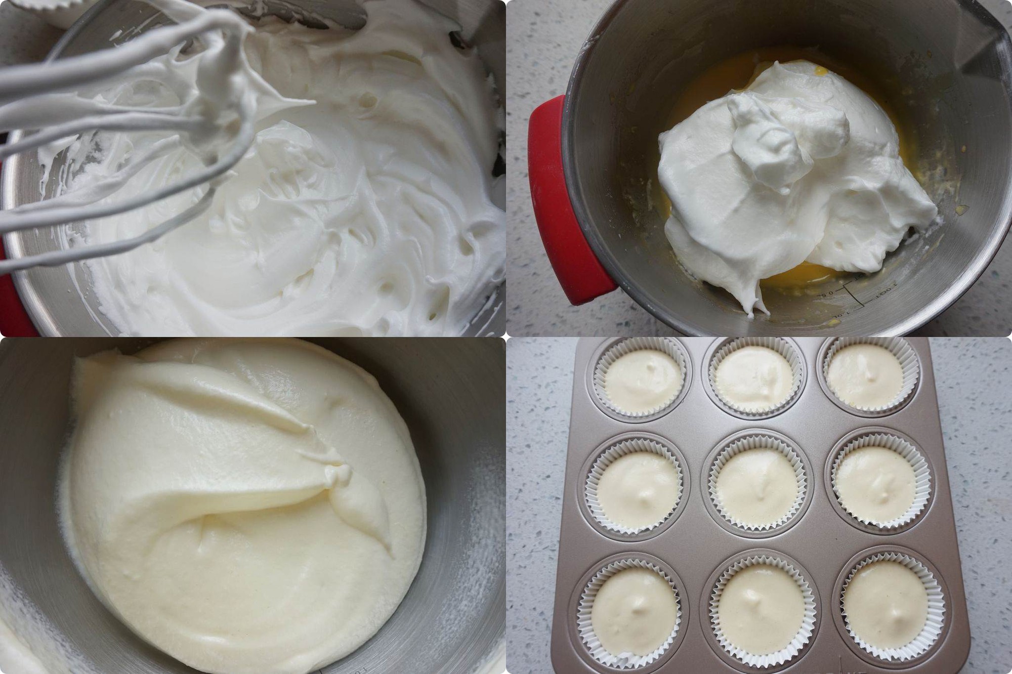 Đánh bông cứng lòng trắng trứng, rồi múc 1/3 lượng lòng trắng trứng vào âu bột trộn đều sau đó đổ tất cả bột vừa trộn vào âu lòng trắng trứng đã đánh cứng còn lại. Bạn trộn nhẹ nhàng để không làm vỡ bọt khí gây xẹp bánh. Đổ bột bánh vào khuôn.