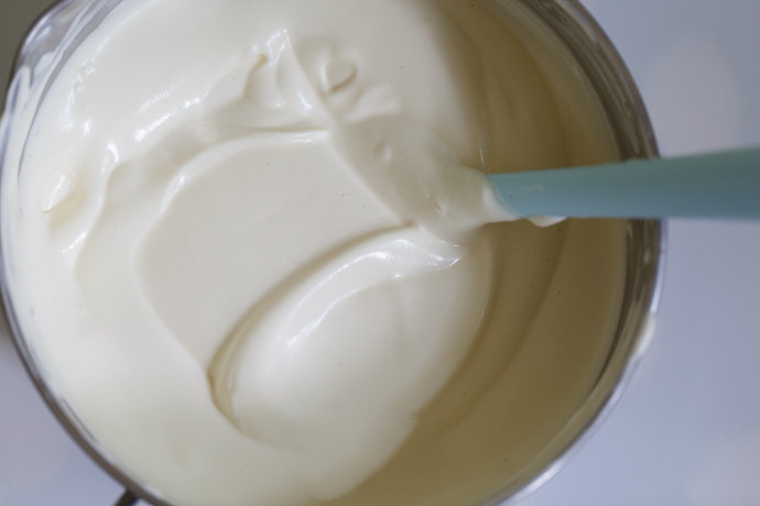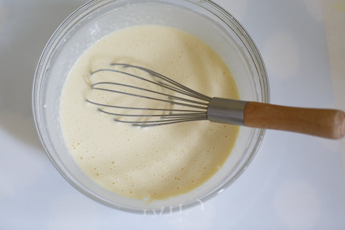 Trứng để ở nhiệt độ phòng, tách riêng lòng đỏ và lòng trắng ra 2 thố khác nhau. Trong thố lòng đỏ trứng thêm sữa tươi, dầu ăn vào rồi trộn đều. Tiếp đó rây bột gạo vào khuấy chung.