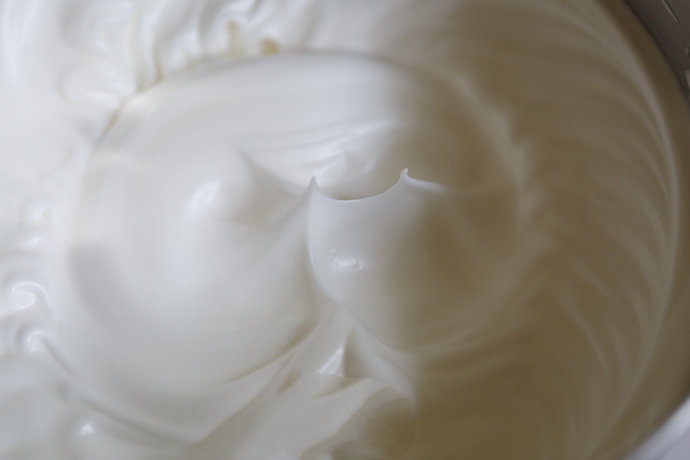 Trong thố lòng trắng trứng thêm từ từ đường vào và dùng máy đánh trứng đánh bông cứng lòng trắng.