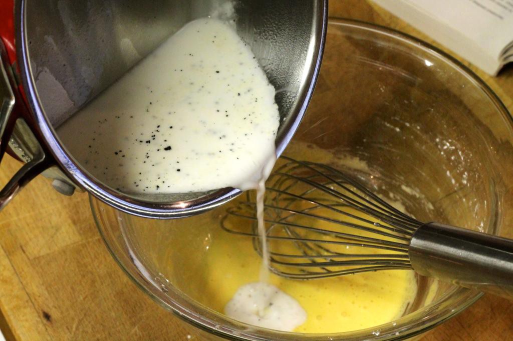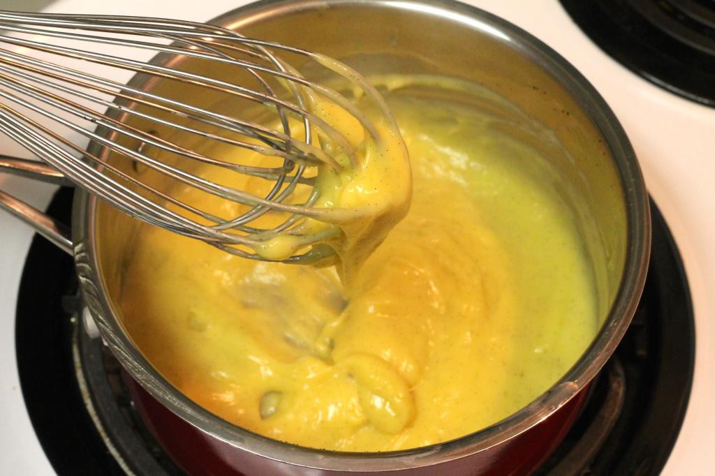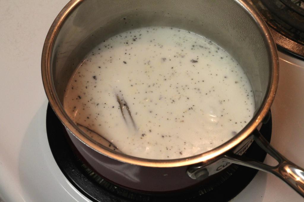 Cho nước cốt dừa và quả vani vào nồi, đun nhỏ lửa cho hỗn hợp ấm, lưu ý trong lúc đun khuấy đều để nước cốt dừa không bị bén.