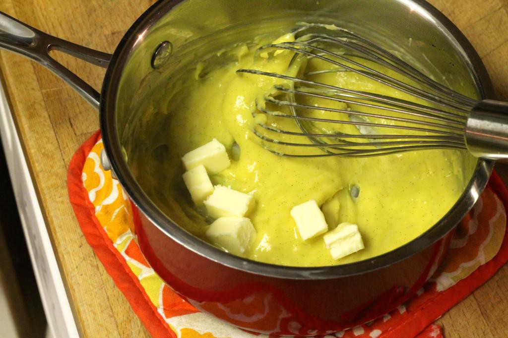 Phần bơ cắt thành từng viên nhỏ rồi thả vào nồi trứng, khuấy đều cho bơ tan hoàn toàn.