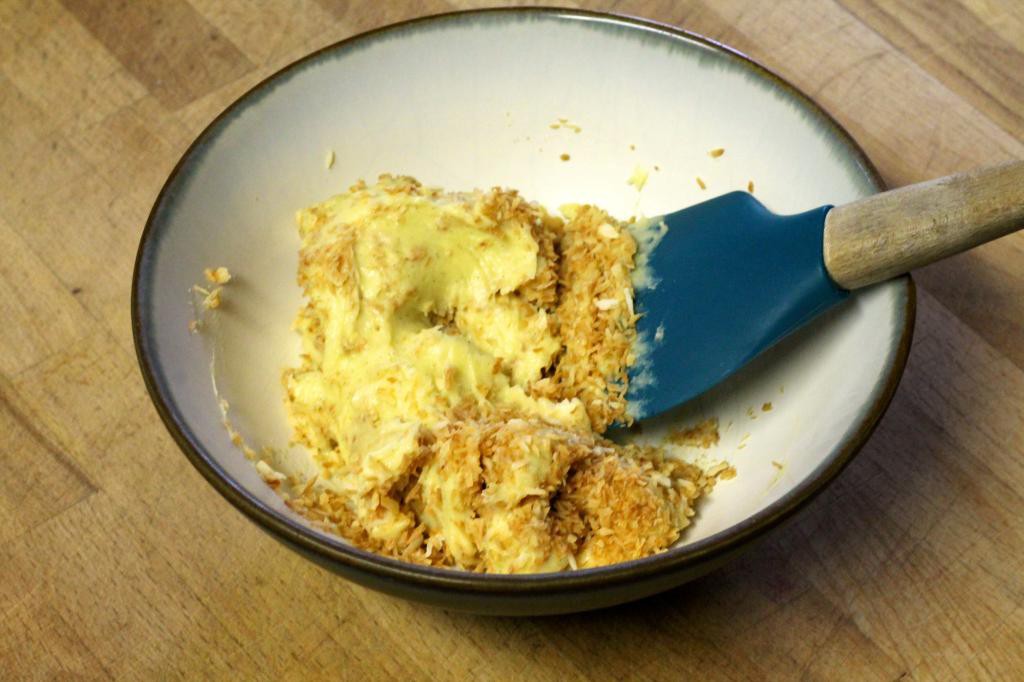 Trút nhân custard ra tô, đổ phần cơm dừa vào trộn đều lên. Bạn có thể đảo sở phần cơm dừa cho chuyển màu vàng trước khi trộn vào nhân custard để tăng thêm mùi thơm của dừa.