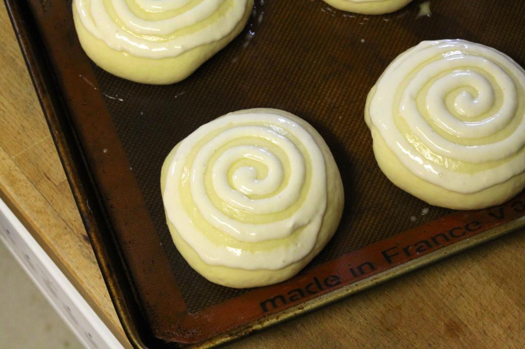 Đánh tan 1 quả trứng với 1 thìa súp nước rồi phết lên mặt bánh. Hòa 3 thìa súp bột mì với chút nước để được hỗn hợp sánh, sau đó cho vào túi bắt kem, cắt đầu túi và vẽ lên mặt bánh hình xoáy ốc.