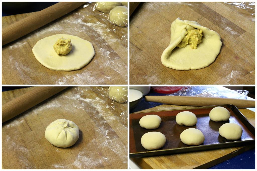 Chia bột làm 6 phần bằng nhau, cán bột thành hình tròn sau đó cho nhân custard vào giữa, vo tròn lại. Đậy khăn ẩm lên mặt bánh ủ tiếp 1-2 giờ.