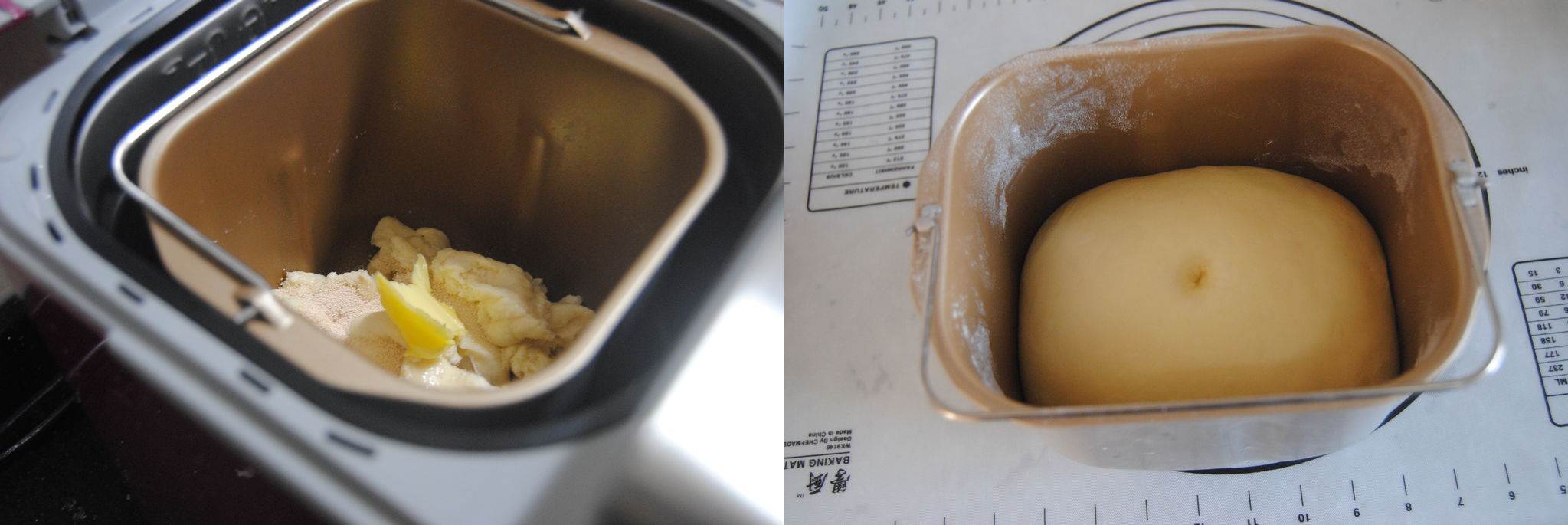 Cho bột mì, sữa đặc, trứng, men nở khô, sữa tươi, muối vào thùng nhào đều thành khối bột đồng nhất sau đó thêm bơ lạt đã làm mềm vào nhào chung thành khối bột dẻo mềm không dính tay. Bạn ủ bột cho đến khi nở gấp đôi.