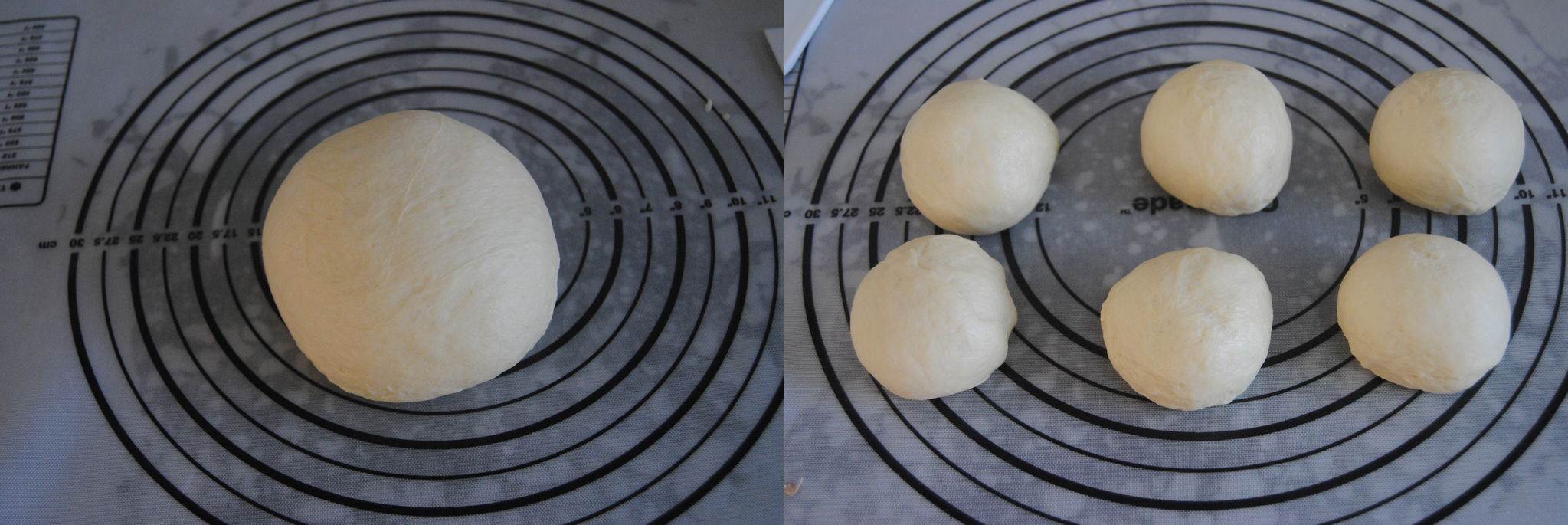 Sau khi bột nở bạn lấy bột ra nhào qua rồi chia bột thành 6 phần bằng nhau.