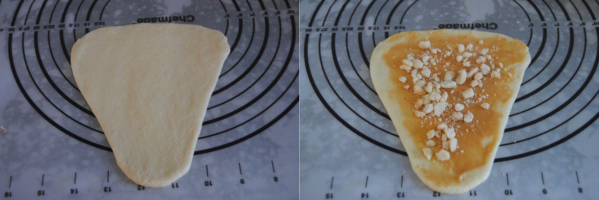 Cán từng viên bột thành tấm hình tam giác, bạn phết bơ đậu phộng lên trên, tiếp đó rắc đậu phộng rang giã dập vào.