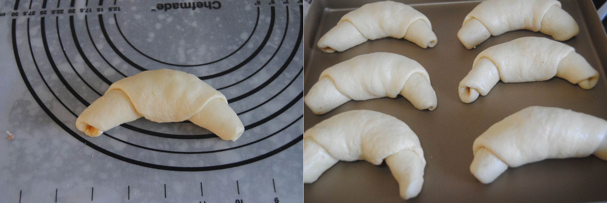Bạn cuộn bánh lại như trên hình, tương tự bạn làm với các phần bột còn lại sau đó để bánh vào khay nướng.