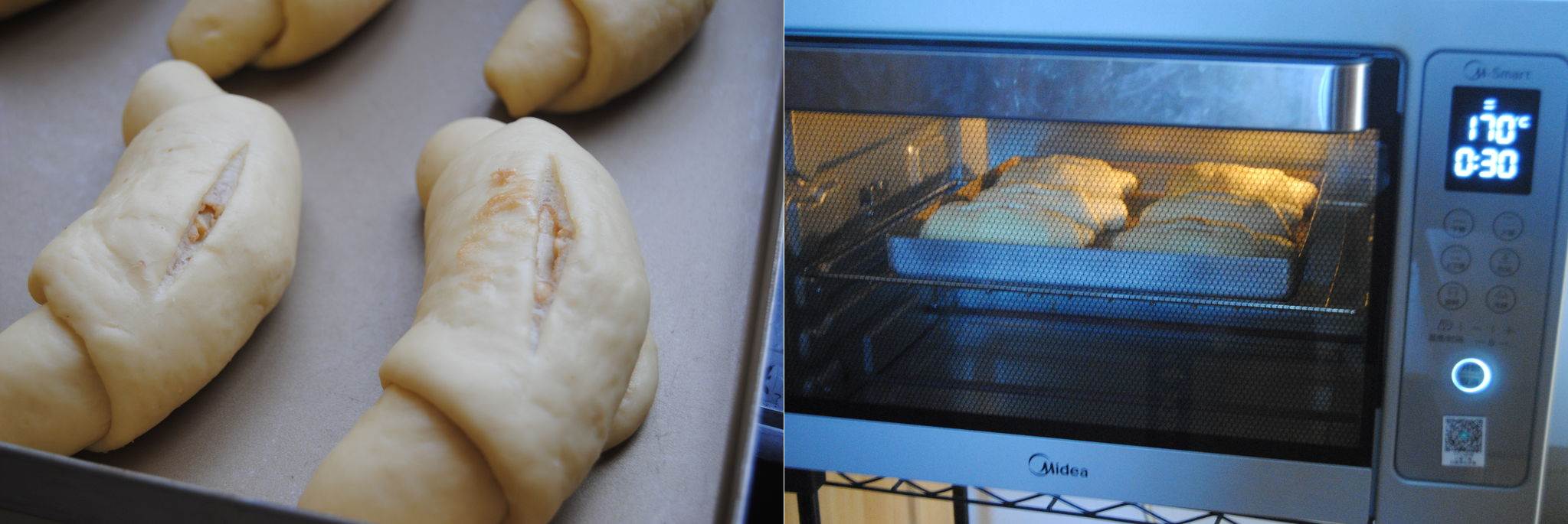 Ủ cho bánh nở gấp đôi rồi dùng dao rạch một đường trên bề mặt bánh, bạn có thể dùng cọ quét một lớp lòng đỏ trứng lên trên bánh rồi cho vào lò nướng. Nướng bánh ở 170 độ C trong khoảng 25 phút là bánh chín. (Bạn nhớ làm nóng lò trước khi cho bánh vào nướng).
