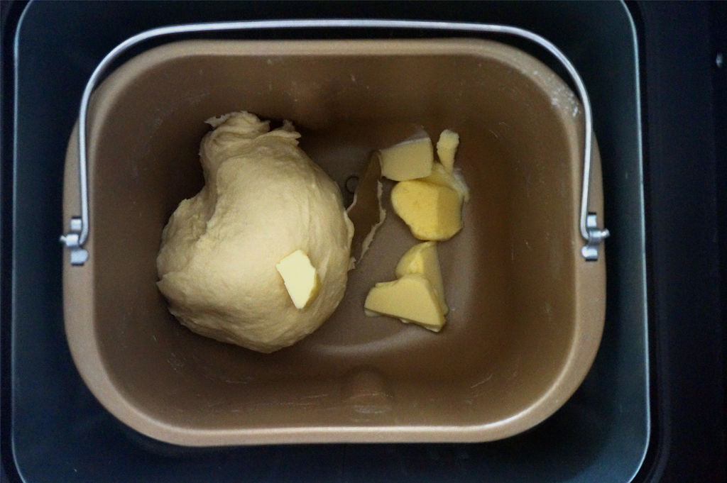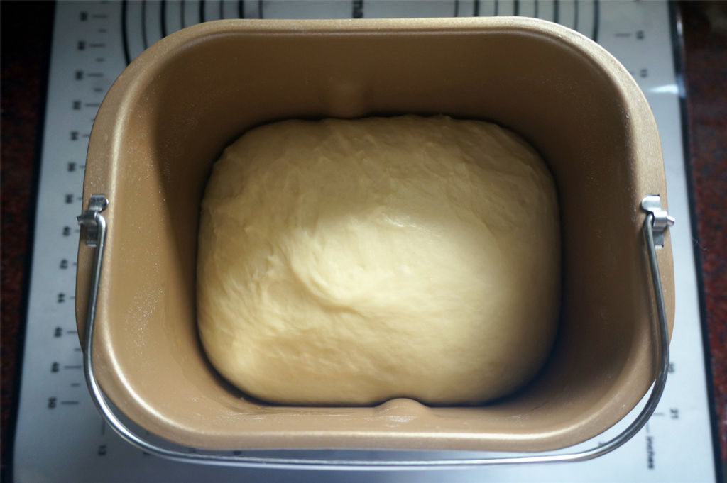 Cho bột mì, bột bánh ngọt, trứng, đường, sữa, muối, men nở và nước vào thùng trộn, trộn đều cho hỗn hợp đồng nhất. Tiếp đó cho bơ vào nhào chung thành khối bột mềm mịn.