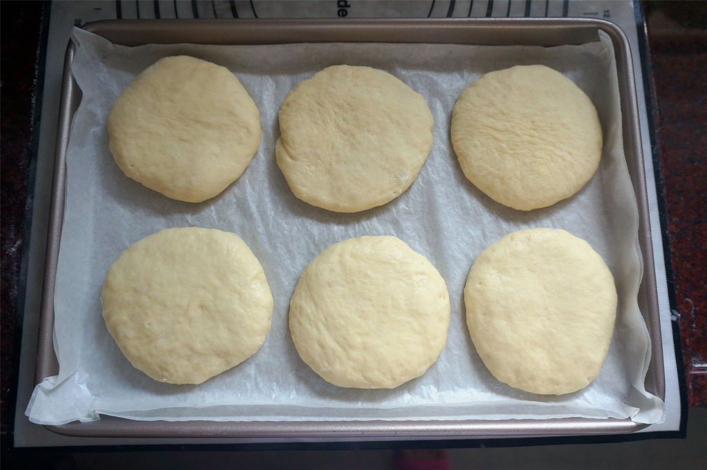 Cho từng viên bột vào khay nướng có lót giấy nướng. Ấn dẹt bột rồi để bột nở gấp rưỡi.