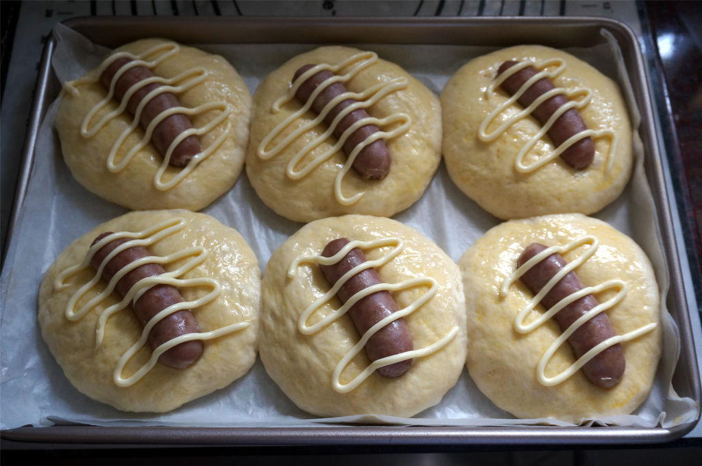 Trong lúc ủ bột lần thứ 2 thì bạn hấp chín xúc xích rồi để nguội. Bật lò nướng ở 180 độ C. Khi bột đã nở bạn dùng cọ quét một lớp lòng đỏ trứng lên trên bề mặt bánh rồi đặt xúc xích vào giữa, rưới thêm sốt mayonnaise lên trên rồi cho bánh vào lò nướng. Nướng bánh khoảng 20 phút là bánh chín vàng.