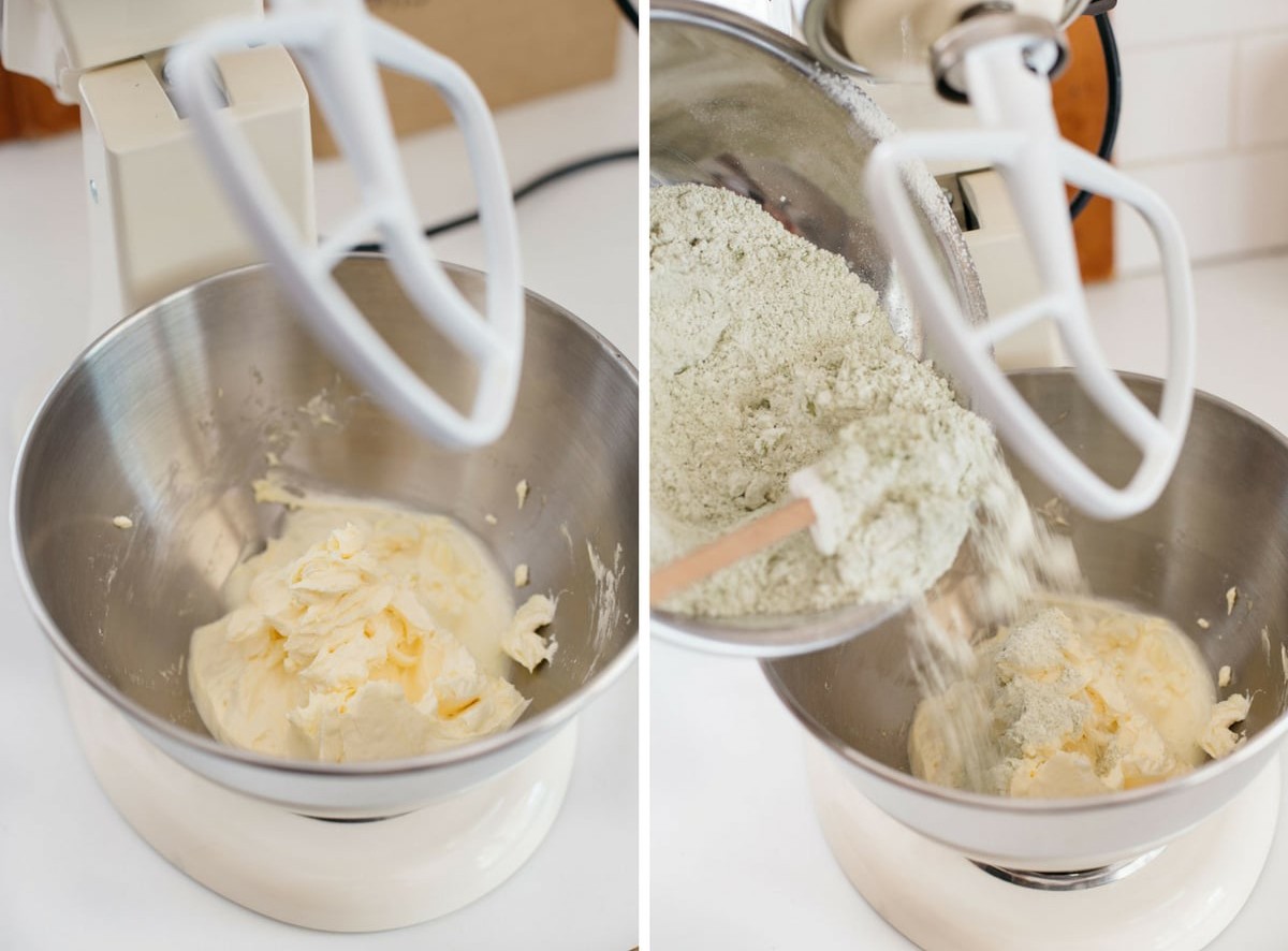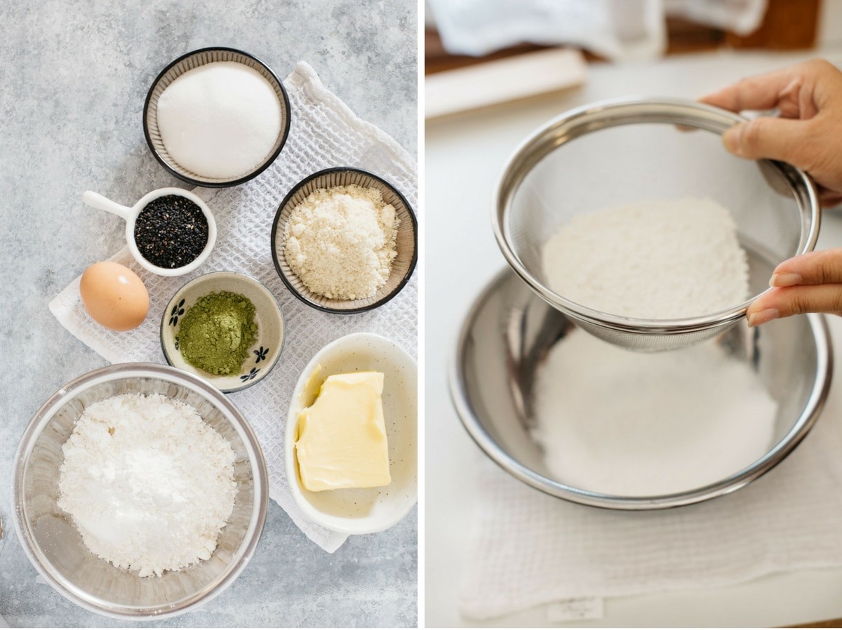 Rây bột mì, bột hạnh nhân qua rây rồi trộn đều sau đó thêm bột trà xanh vào trộn đều.