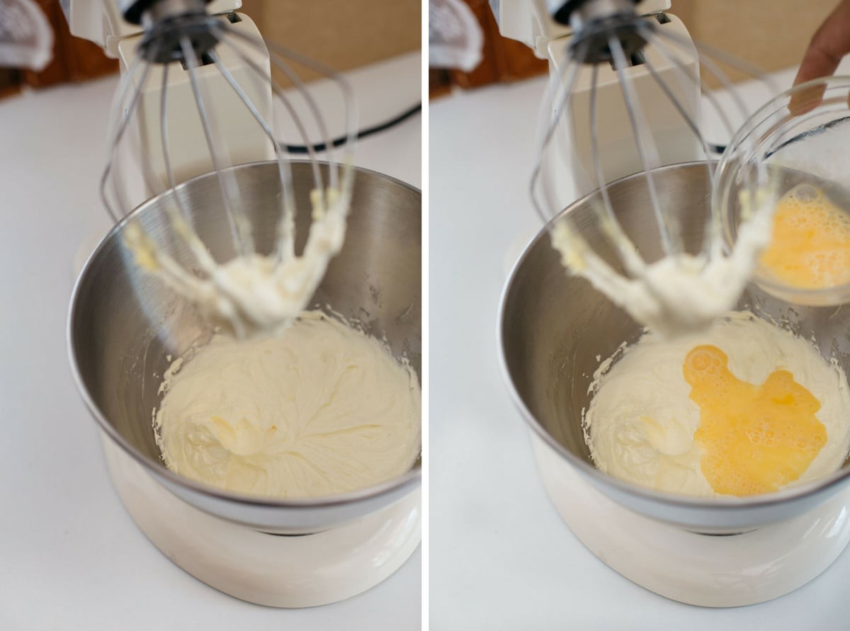 Cho bơ và đường vào tô, dùng máy đánh trứng đánh cho tới khi bơ chuyển màu trắng ngà thì cho trứng vào tiếp tục đánh cho hỗn hợp đồng nhất.
