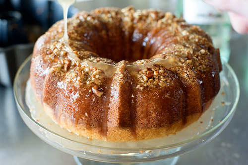 Bánh đã chín, lấy bánh ra, rưới xốt này lên mặt, sau đó úp ngược bánh để lật hình cánh hoa lên trên, tiếp tục rưới phần xốt còn lại lên và cắt bánh làm từng phần nhỏ khi dùng.