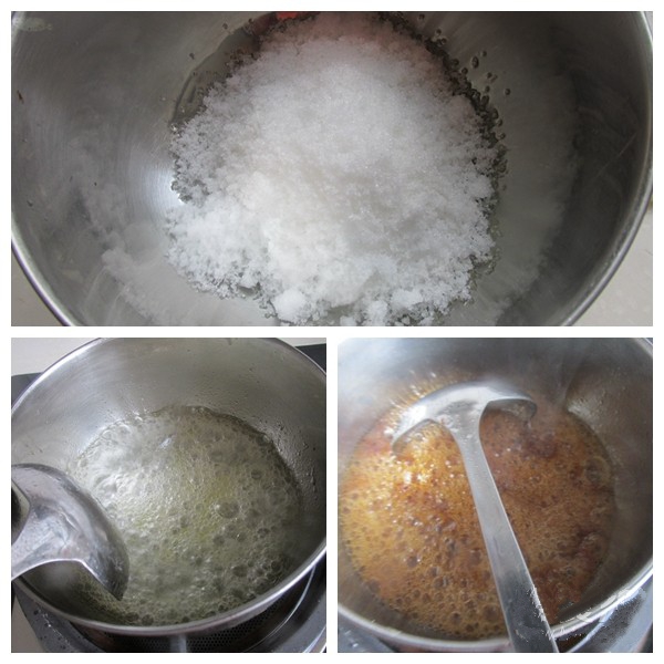 Cho đường vào nồi, thêm lượng nước đủ thấm hết đường vào đun sôi rồi hạ nhỏ lửa. Vừa đun bạn vừa khuấy.