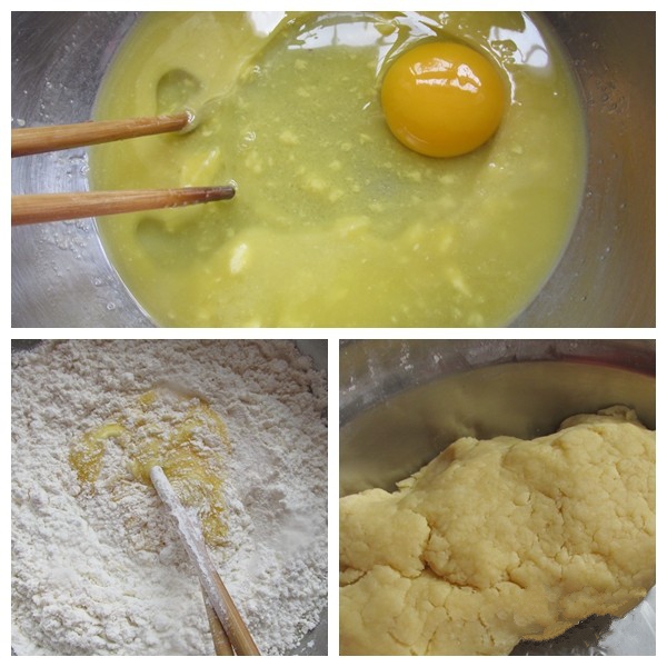 Đun tan chảy 50g bơ, đập trứng vào âu bơ đánh cho trứng tan. Rây bột mì vào âu bơ trứng rồi trộn đều thành khối bột đồng nhất. Cho bột vào tủ lạnh.