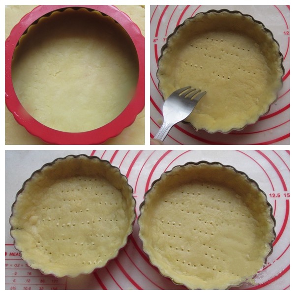 Lấy 10g bơ là tan chảy, dùng cọ quét bơ vào khuôn bánh để chống dính. Khi bột đã cứng hơn bạn lấy ra cán mỏng, cho tấm bột vào khuôn bánh tart. Dùng nĩa để tạo những lỗ nhỏ trên bề mặt bánh, tránh bánh bị phồng. Cho khay bánh vào lò nướng nướng ở 220 độ C trong khoảng 10 phút.