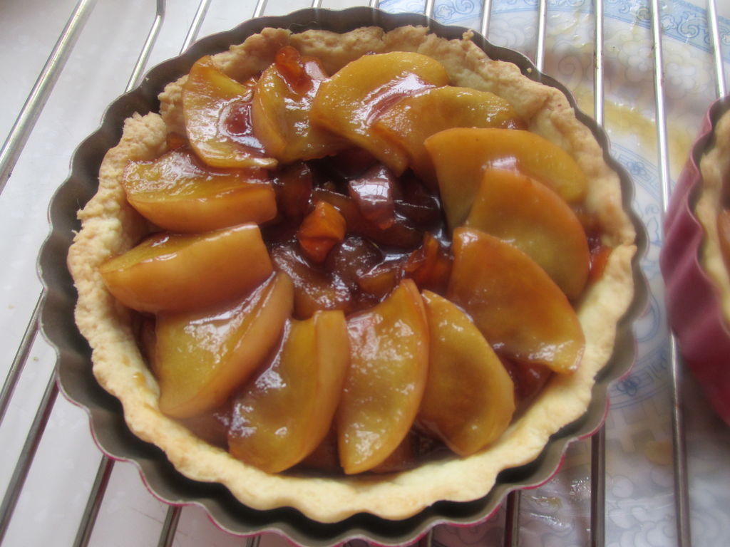 Lấy đế bánh ra cho táo caramel vào rồi lại cho vào lò nướng, nướng ở 220 độ C trong khoảng 5 phút là được.