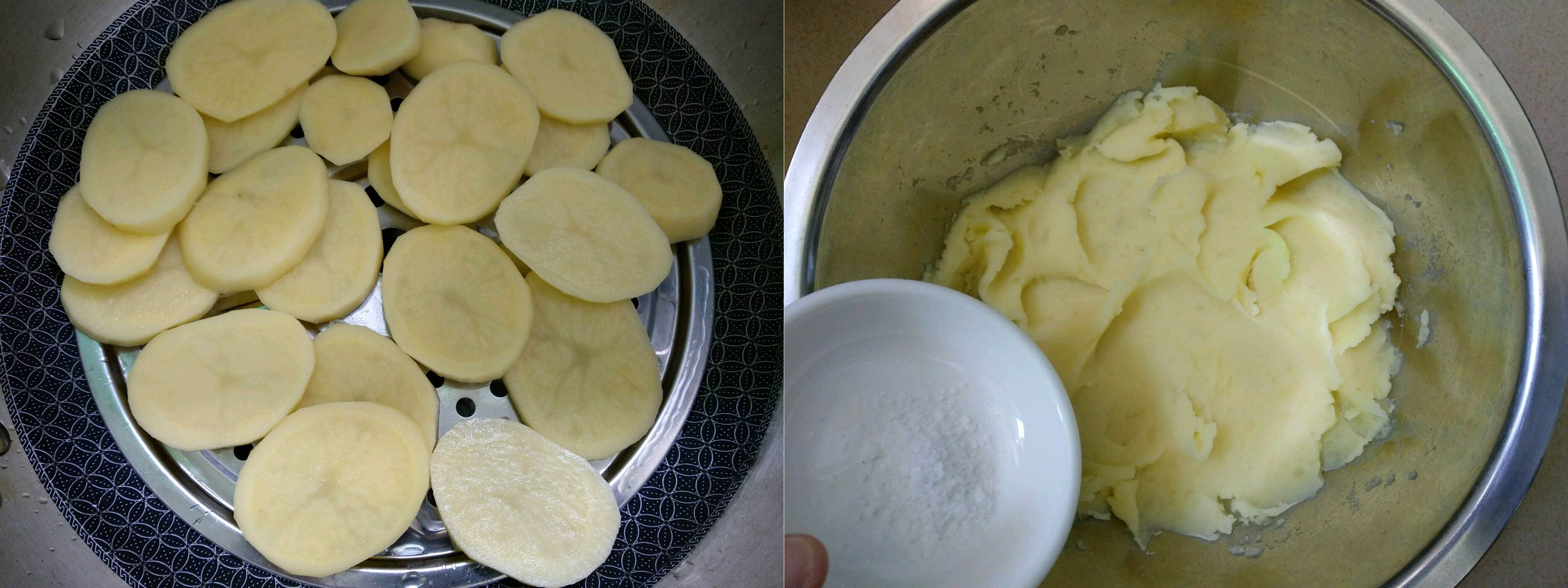 Khoai tây gọt vỏ thái lát mỏng rồi cho vào nồi hấp chín. Lấy khoai tây ra tô rồi nghiền mịn, tiếp đó cho muối vào trộn đều.