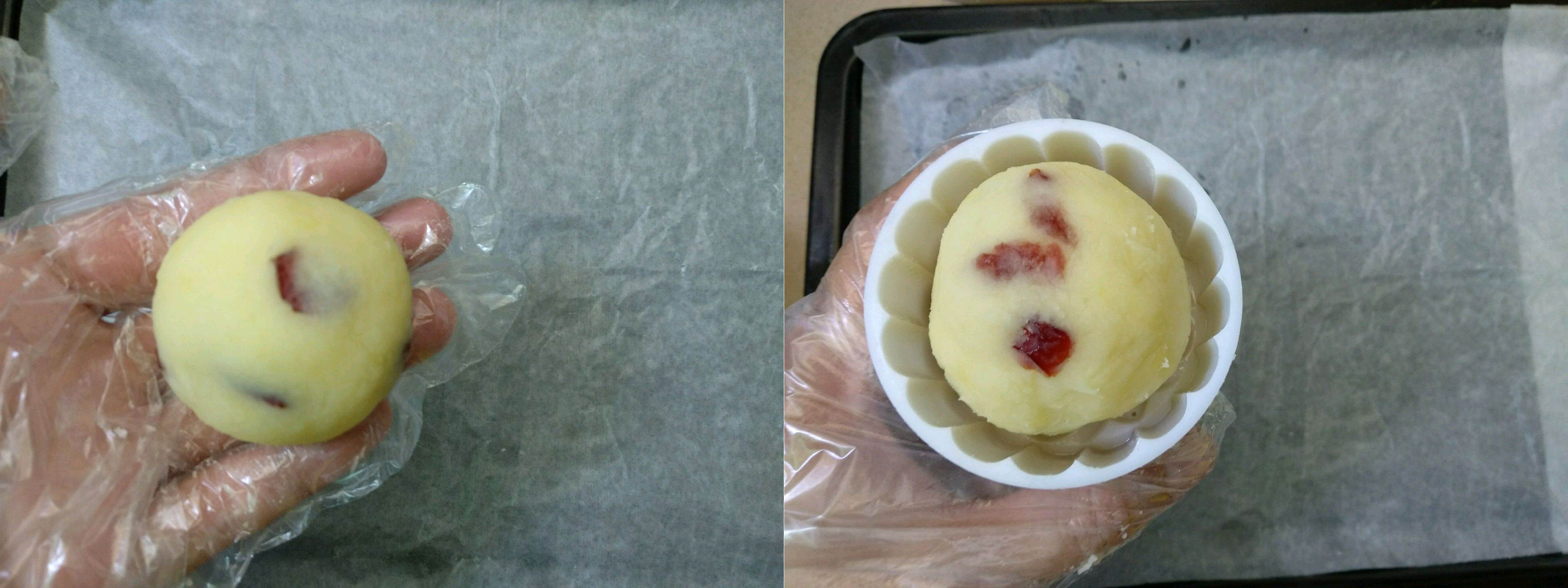 Chia bột khoai tây đã trộn thành từng viên nhỏ khối lượng khoảng 80g rồi viên tròn lại. Dùng cọ quét một ít dầu ăn lên khuôn bánh trung thu. Cho viên bánh vào khuôn.