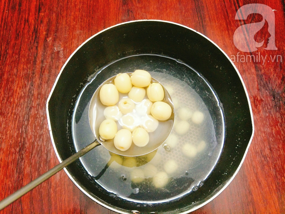 Cho lượng nước vừa đủ vào nồi đun cho sôi sau đó cho hạt sen vào ninh cho tới khi hạt sen chín mềm thì vớt ra.