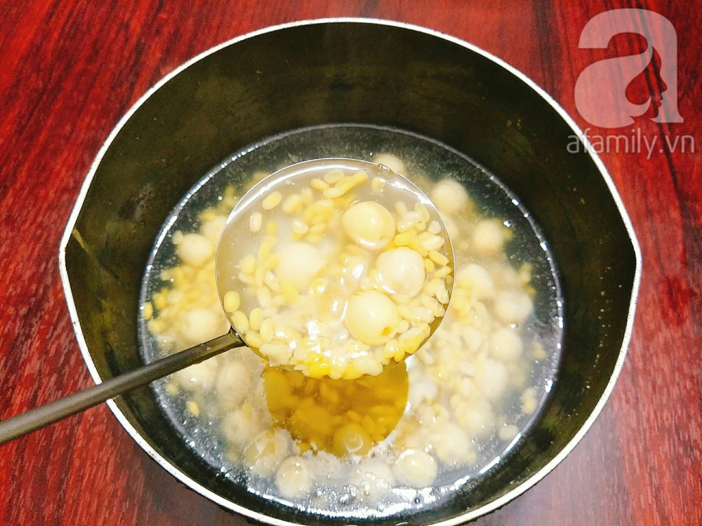 Đỗ xanh sau khi ngâm xong thì đổ ra để ráo nước, đổ nước vào nồi nấu cho sôi sau đó bạn cho đỗ xanh vào nấu vài phút cho đỗ xanh vừa chín thì cho hạt sen vào nấu cùng.