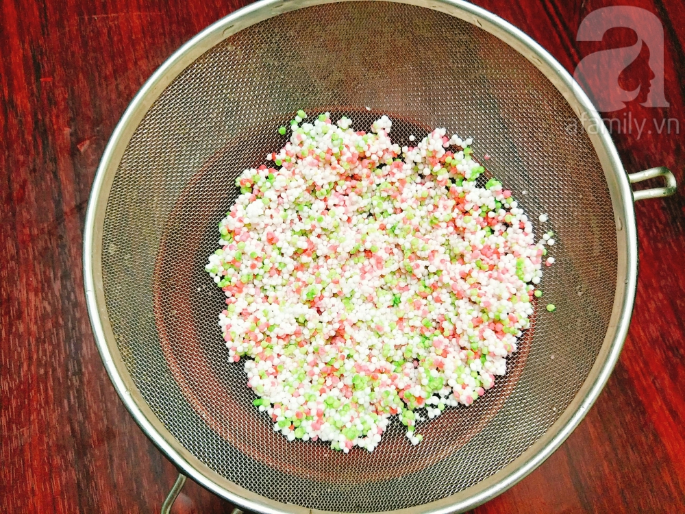 Bột báng cho vào bát, thêm nước và ngâm vài phút cho nở mềm sau đó đổ ra cho ráo nước.