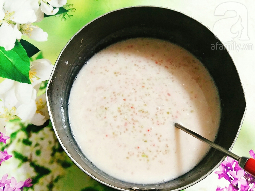 Cho nước vào nồi đun sôi rồi cho bột báng vào luộc vài phút tới khi thấy bột báng chuyển màu trong là bột báng đã chín, thêm nước cốt dừa, đường và khuấy đều, lượng đường và nước cốt dừa bạn có thể tùy chỉnh sao cho độ ngọt như ý là được, hỗn hợp sôi trở lại là tắt bếp, để cho nguội.