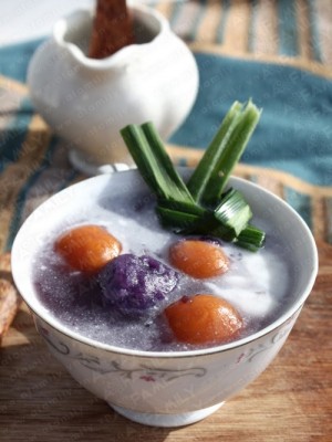 – Khoai lang tím khá khô và không dẻo như khoai lang vàng nên khi đun màu của khoai lang sẽ ra màu tím rất đẹp, viên khoai dù không được tròn nhưng ăn lại ngon. Nếu không có thời gian bạn dùng 1 loại khoai nấu chè cũng được.