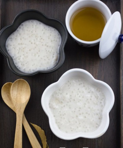 Trong khi đó, đun sôi 2 chén nước. Khi nước sôi, cho hạttrân châu vào và đun trong 6 phút.