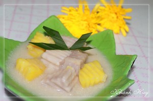 – Khoai thái miếng vuông, lá dứa rửa sạch, cắt khúc, bó lại.