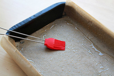 – Đầu tiên, bạn làm nóng lò ở 165 độ. Chuẩn bị khuôn hình chữ nhật, phủ lớp giấy nến lên trên rồi phết dầu ăn lên đều khắp mặt giấy. Lớp dầu ăn này sẽ giúp bạn lấy bánh ra dễ dàng hơn sau khi nướng đấy! |