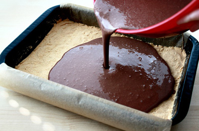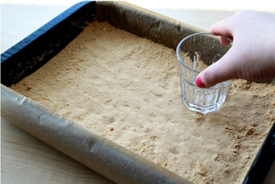 – Xay nhỏ bánh quy cho đến khi thật mịn rồi cho vào khuôn. Ấn đều để bánh quy nén chặt và bằng phẳng. |