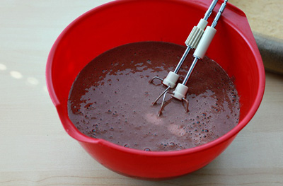 – Trộn cream cheese và sour cream vào với nhau, đảo đến khi thật mịn. Sau đó cho thêm cacao, siro ngô, đường, vani và trứng vào đánh đến khi hỗn hợp mịn trở lại. |