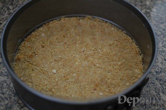 Xay bánh quy cho vụn rồi trộn cùng bơ và đường. Nén chặt phần bánh quy vào khuôn bánh. Cho khuôn bánh vào tủ lạnh trong thời gian làm phần filling.