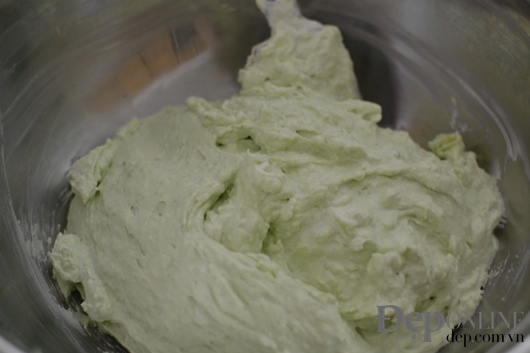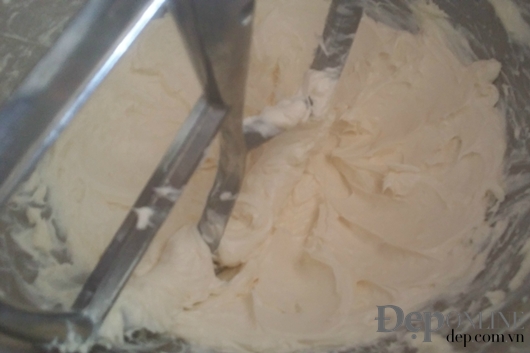 Cho kem tươi vào âu nhôm khác, dùng máy đánh trứng đánh đến khi kem tươi bông nhẹ và nổi vân. Cho kem tươi đã đánh bông vào hỗn hợp cream cheese, trộn nhẹ nhàng để hỗn hợp hoà quyện với nhau.