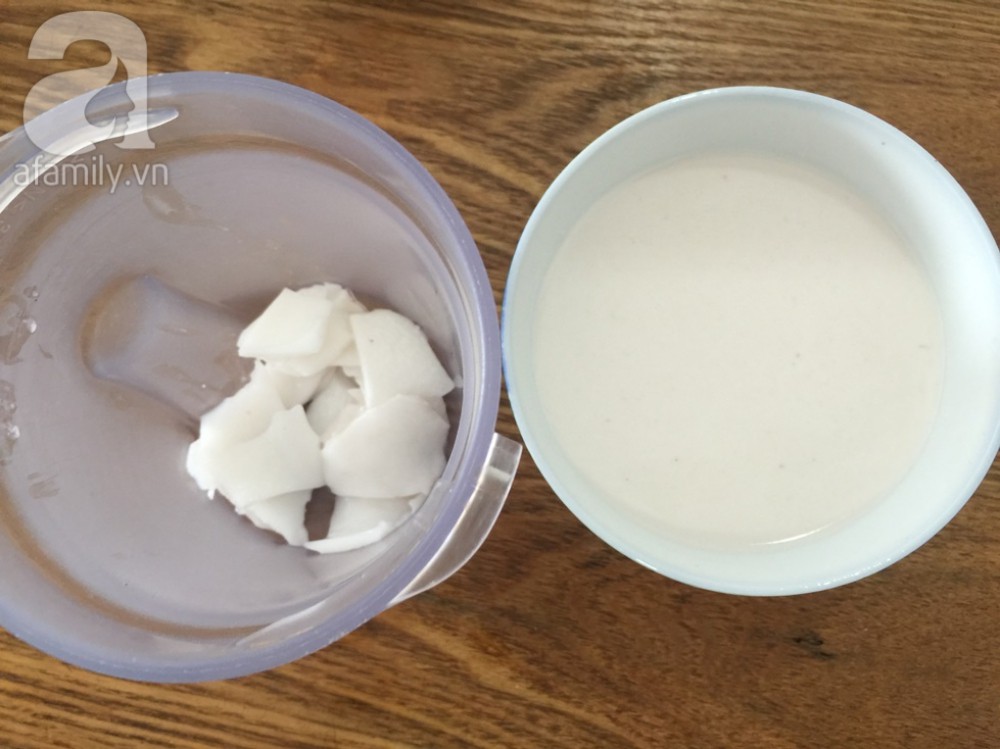Nạo ¼ cơm dừa và thái nhỏ, xay cùng với nước cốt dừa và sữa đặc có đường.