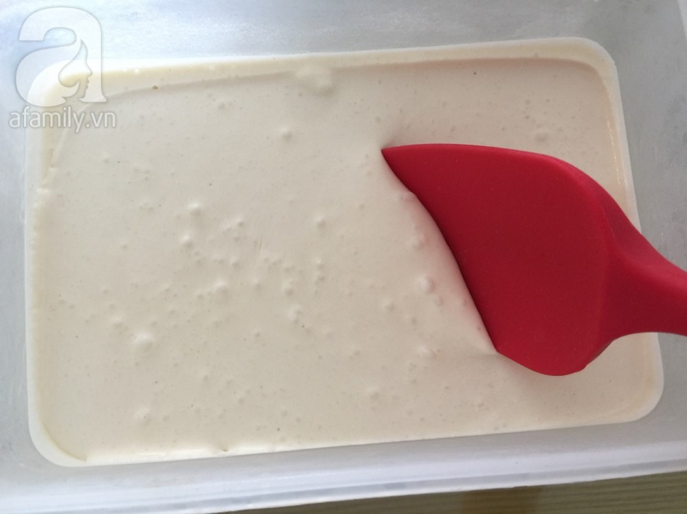 Sau 3 giờ giữ đông, lấy hộp kem ra dằm nhẹ và trộn đều để kem dẻo và không bị dăm đá. Lặp lại quy trình này khoảng 3-4 lần.