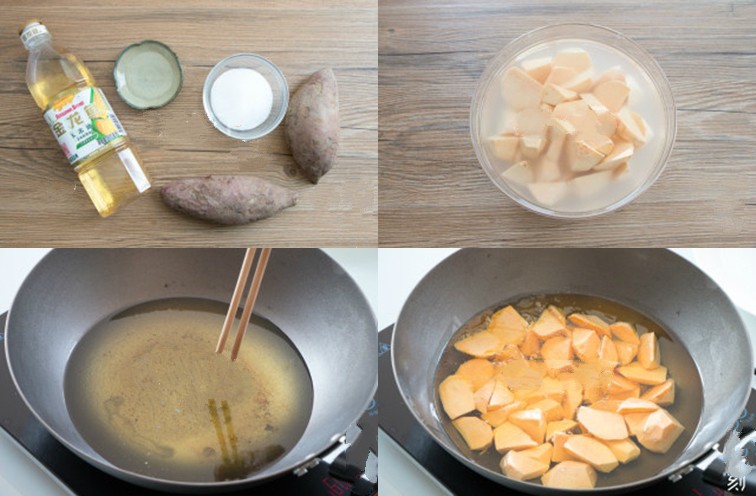 Đầu tiên, bạn gọt vỏ khoai lang sau đó cắt thành từng miếng vuông vừa ăn, khi cắt bạn nhớ ngâm khoai trong nước để khoai không bị đen nhé. Sau đó, vớt khoai ra rổ và để ráo. Bắc chảo ngập dầu lên bếp, khi dầu nóng đều thì cho khoai lang vào chiên vàng giòn (khoảng 8-10 phút).