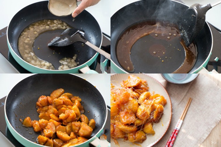 Bạn nhớ đảo đều cho đường không bị cháy và thêm vào chút giấm cho đến khi đường tan hết, chuyển thành caramel thì cho khoai lang chiên vào, đảo đều tay cho khoai lang thấm đường rồi tắt lửa, vớt ra đĩa và trang trí.