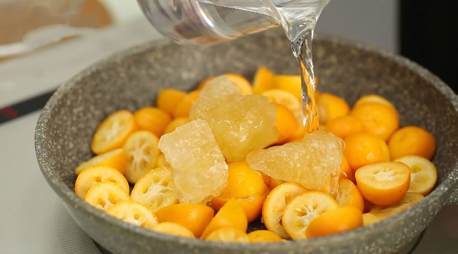 Cho quất vào nồi, thêm đường phèn và nước lọc vào đun sôi rồi hạ nhỏ lửa đun cho đến khi nồi quất sánh lại.