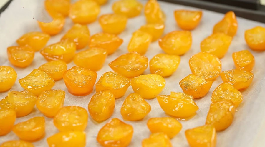 Cho quất ra khay nướng có lót giấy nướng. Cho khay quất vào lò nướng ở 100 độ C trong 30 phút cho bề mặt quất khô ráo. (Đặt chế độ 2 lửa).