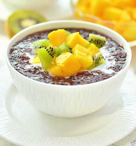 – Món nếp cẩm này hợp cho bữa điểm tâm mỗi sáng. Có công dụng điều trị chứng chóng mặt, thiếu máu, tóc bạc sớm và các bệnh về mắt.