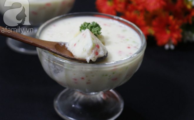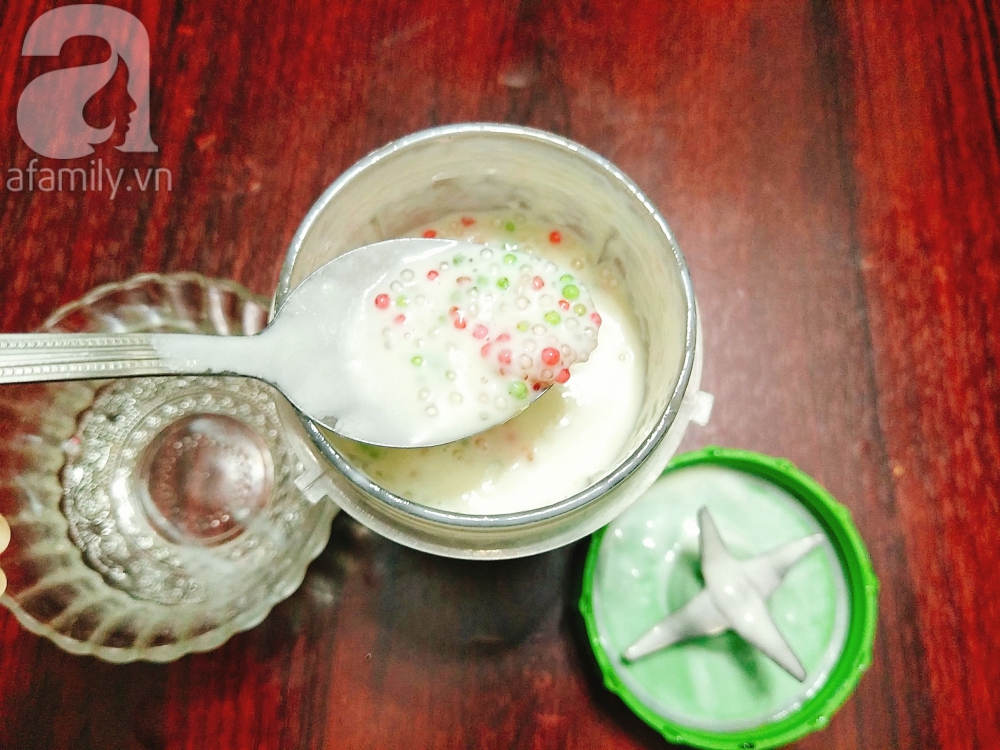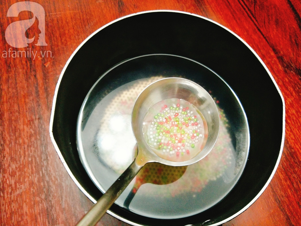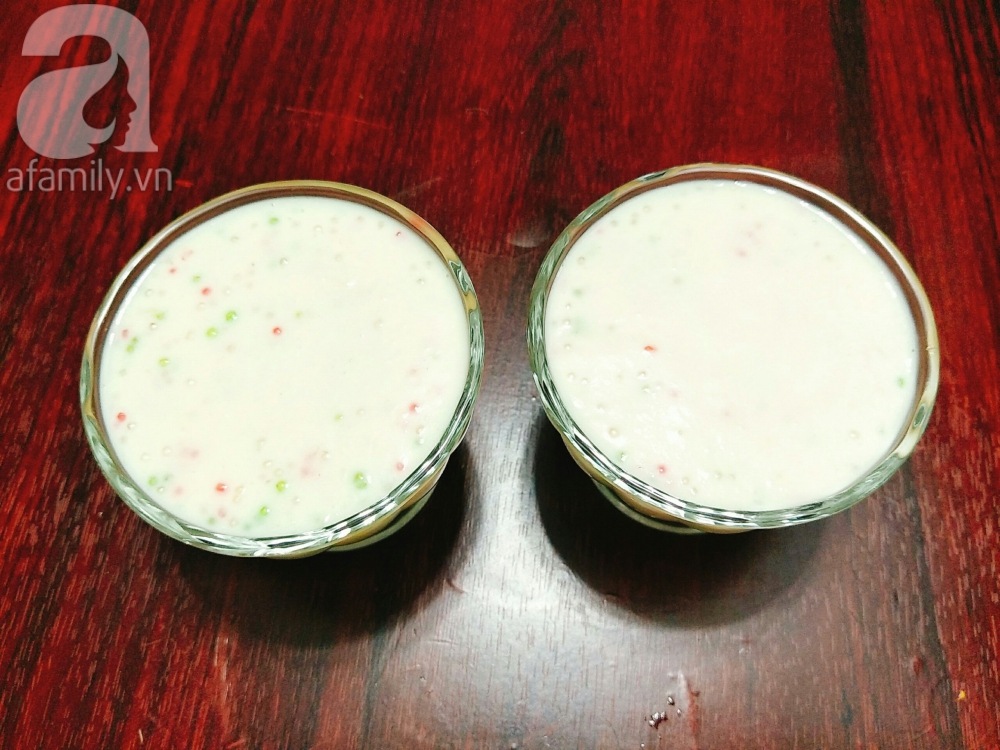 Vớt bột báng cho vào máy xay sinh tố rồi thêm gelatin tan chảy, khuấy đều hỗn hợp là xong rồi nhé.