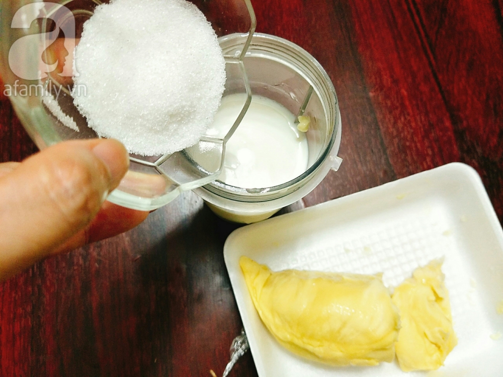 Cho sầu riêng, sữa tươi, đường vào máy xay sinh tố, đậy nắp và xay nhuyễn hỗn hợp.