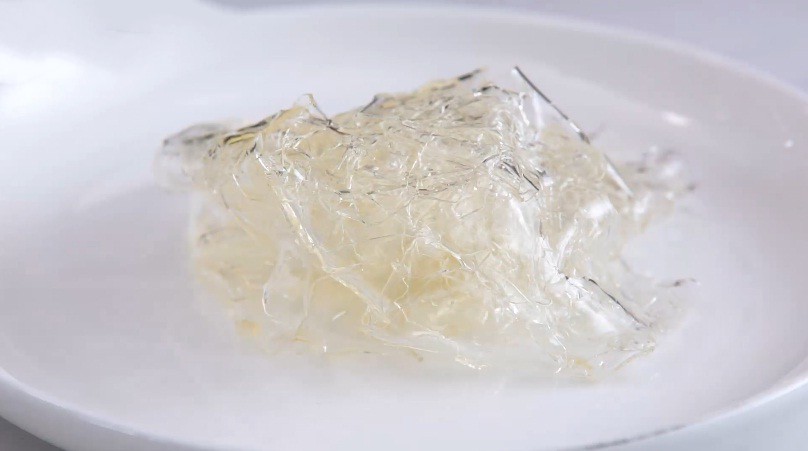 Lá gelatin ngâm với nước lạnh cho đến khi mềm rồi lấy ra đĩa.